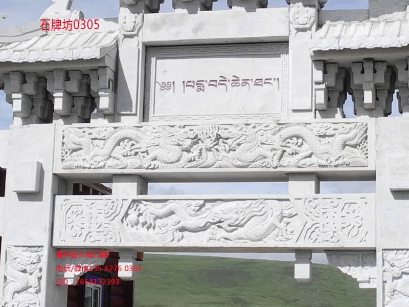 上面的一門三樓石牌坊建筑,安裝在四川省甘孜洲白玉縣昌臺(tái)區(qū)亞青寺,用漢白玉石材精心雕刻而成,由專業(yè)石牌坊廠家——嘉祥縣長城石雕廠提供。